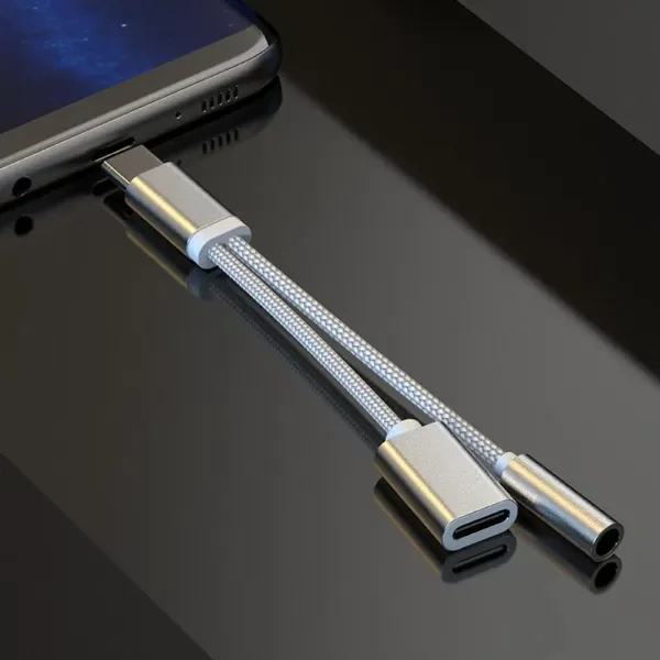 El Adaptador Tipo C Dos en Uno 3.5 + Carga es la solución perfecta para quienes quieren disfrutar de su música sin renunciar a la carga de su dispositivo.